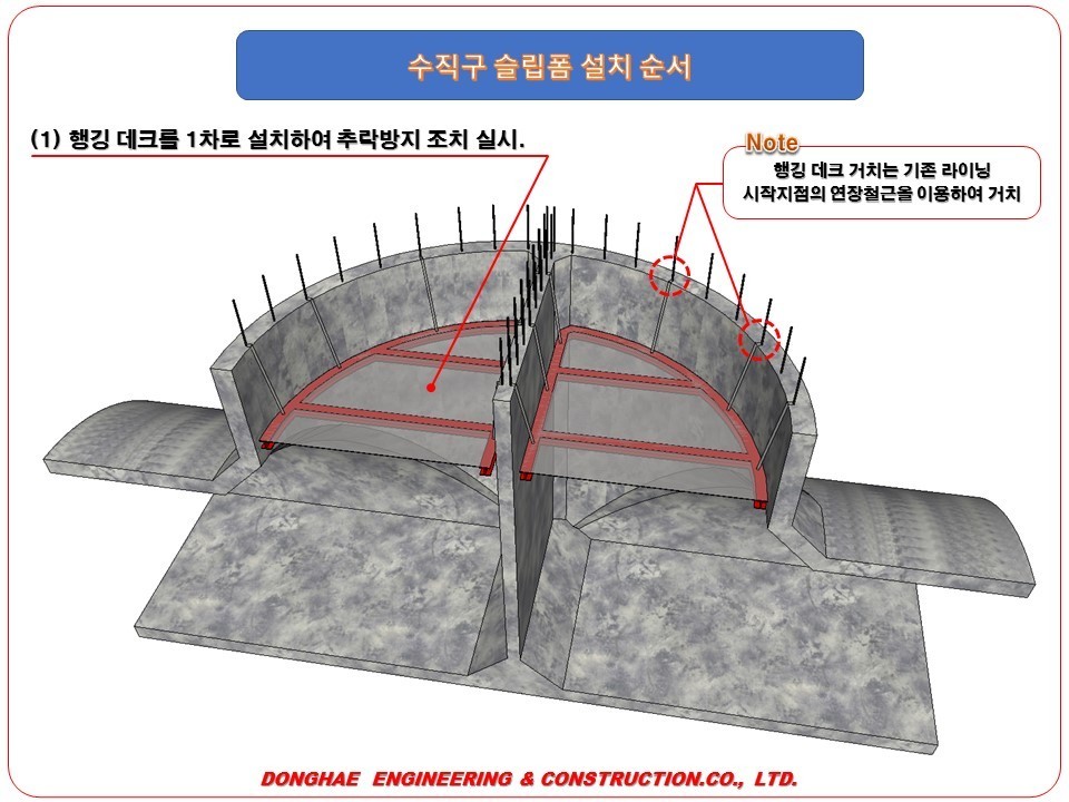 - 행깅 데크 거치는 기존 라이닝 시작 지점의 연장 철근을 이용하여 거치.