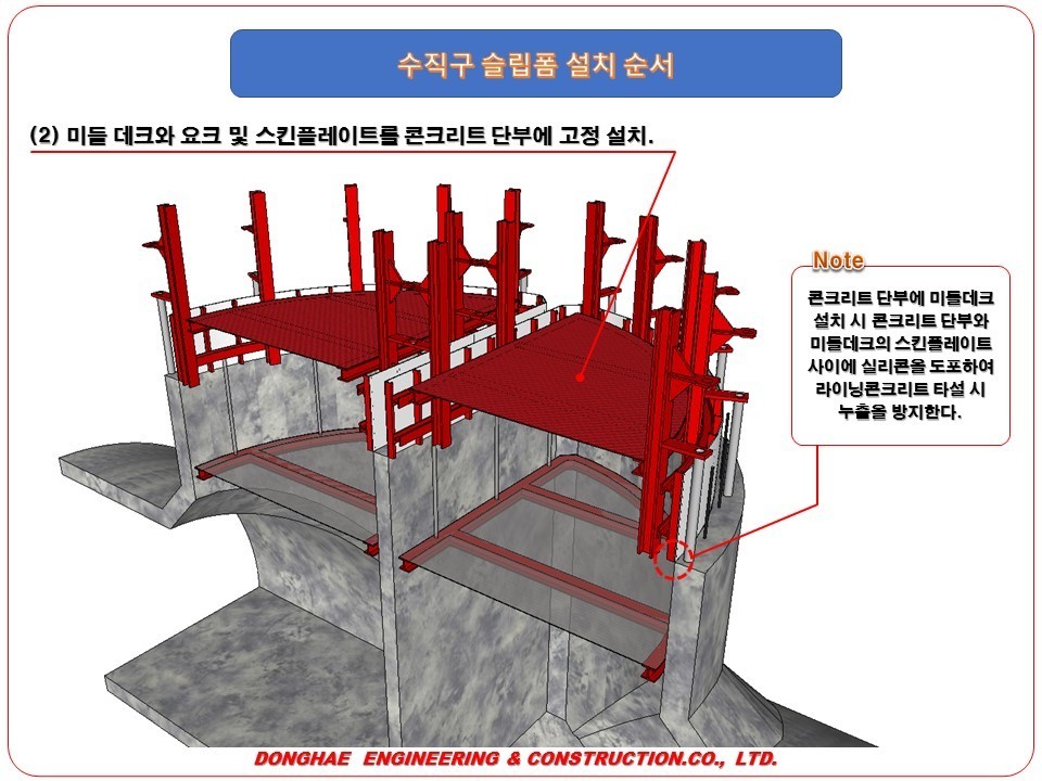 - 콘크리트 단부에 미들데크 설치 시 콘크리트 단부와 미들 데크의 스킨 플레이트 사이에 실리콘을 도포하여 라이닝 콘크리트 타설 시 누출을 방지한다.
